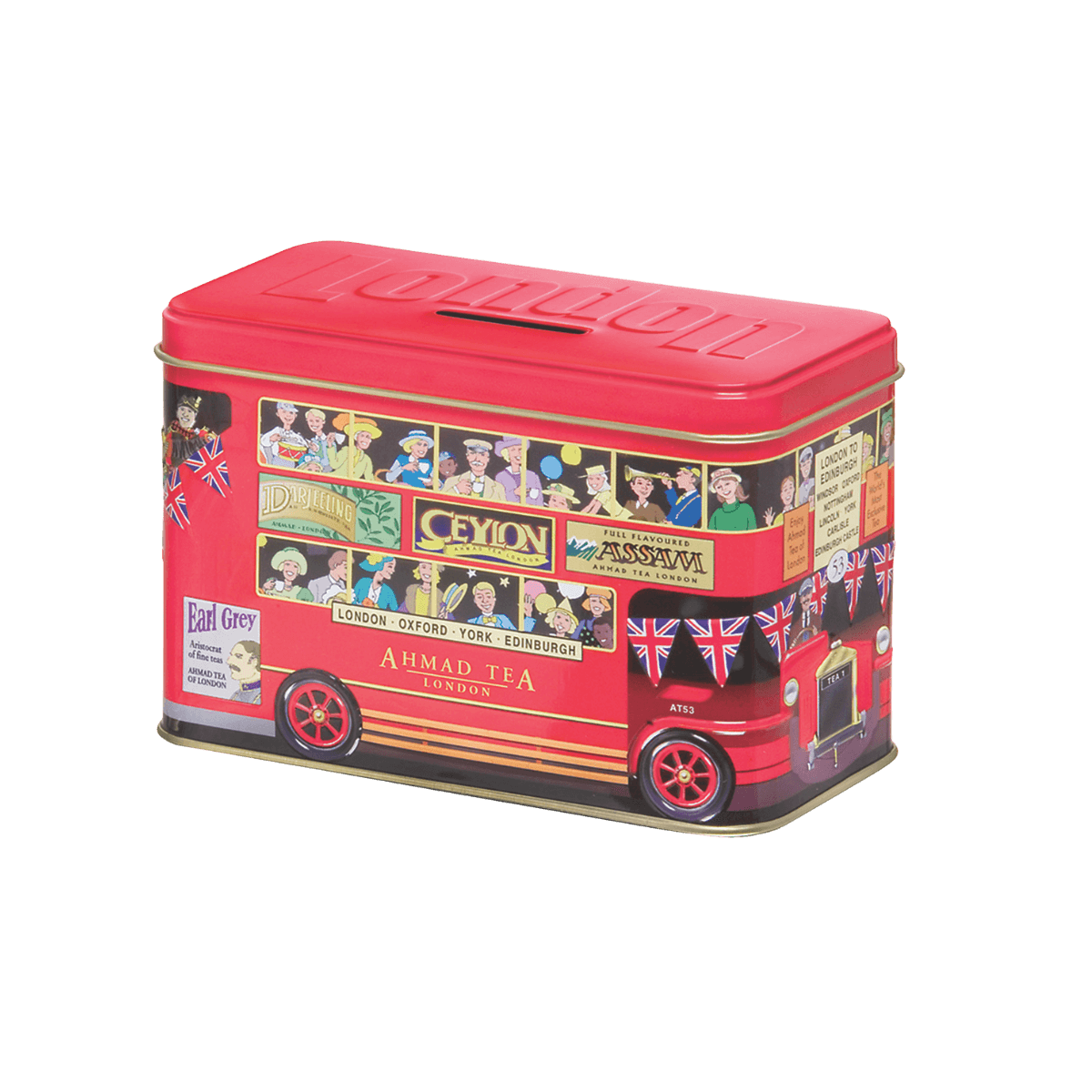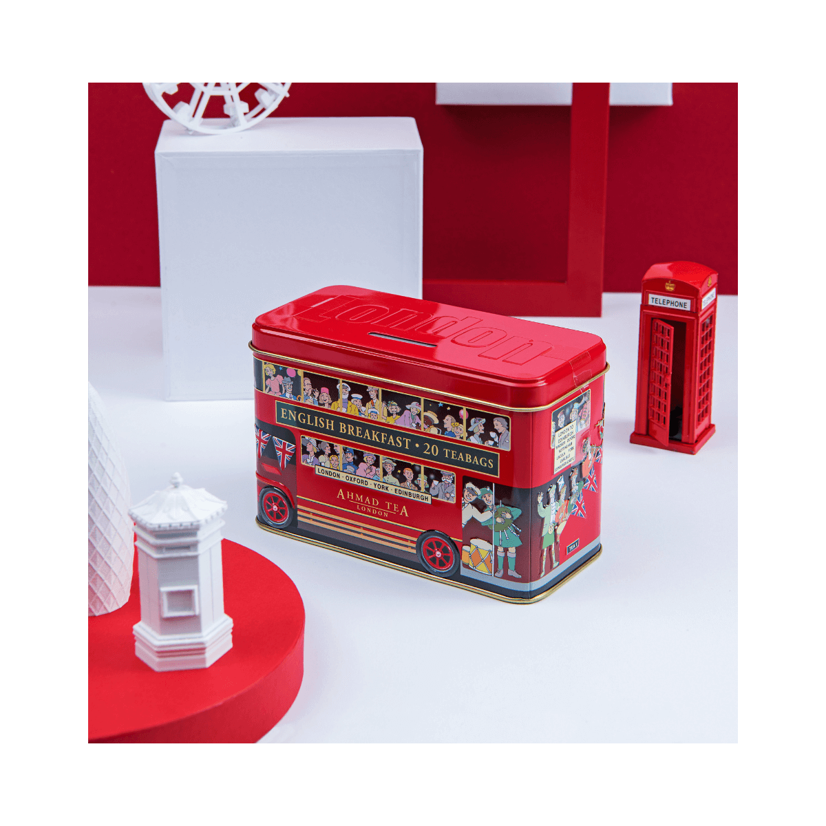 This adorable red double-decker bus is an icon of English life in London city. This tin caddy with a hinged lid contains 20 foil-enveloped English Breakfast tea bags. Treasure the caddy and reuse to store more teabags or use as a money box.